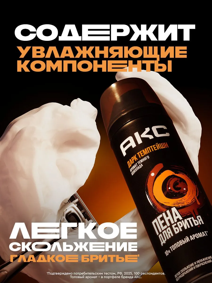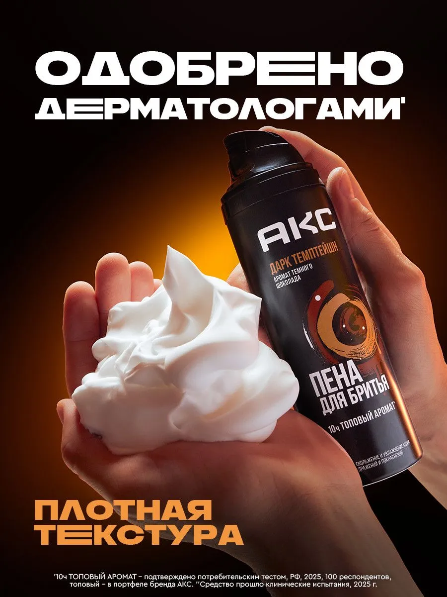 Пена для бритья для мужчин увлажняющая Акс Дарк Темптейшн. Идеальное косметическое средство для ухода за кожей с топовым* запахом темного шоколада, разработанное для взрослых мужчин и подростков с 14 лет с любым типом кожи лица.