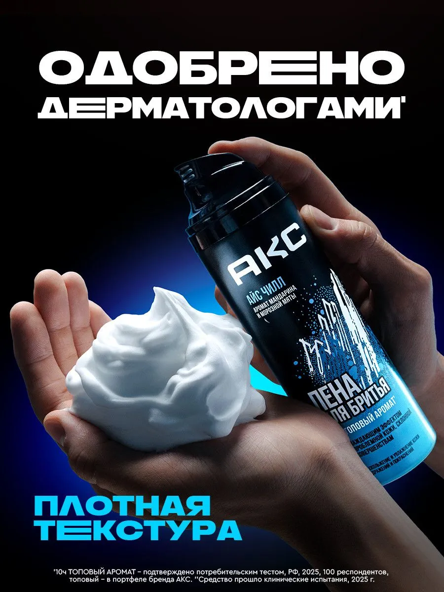 Пена для бритья для мужчин с охлаждающим эффектом Акс Айс Чилл. Идеальное косметическое средство для ухода за кожей с топовым* запахом мандарина и морозной мяты, разработанное для взрослых мужчин и подростков с 14 лет с проблемной и склонной к несовершенствам кожей лица.