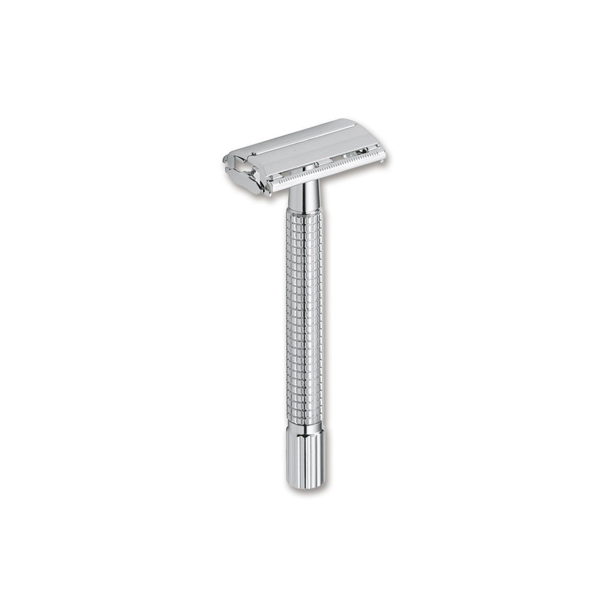 Для любителей более длинной ручки бритва Boker Butterfly L разработана с механизмом «бабочка» . Повернув кончик ручки, вы откроете головку бритвы и получите доступ к лезвию. Хромированная цельнометаллическая конструкция современного серо-стального цвета с неброским логотипом на нижней стороне.