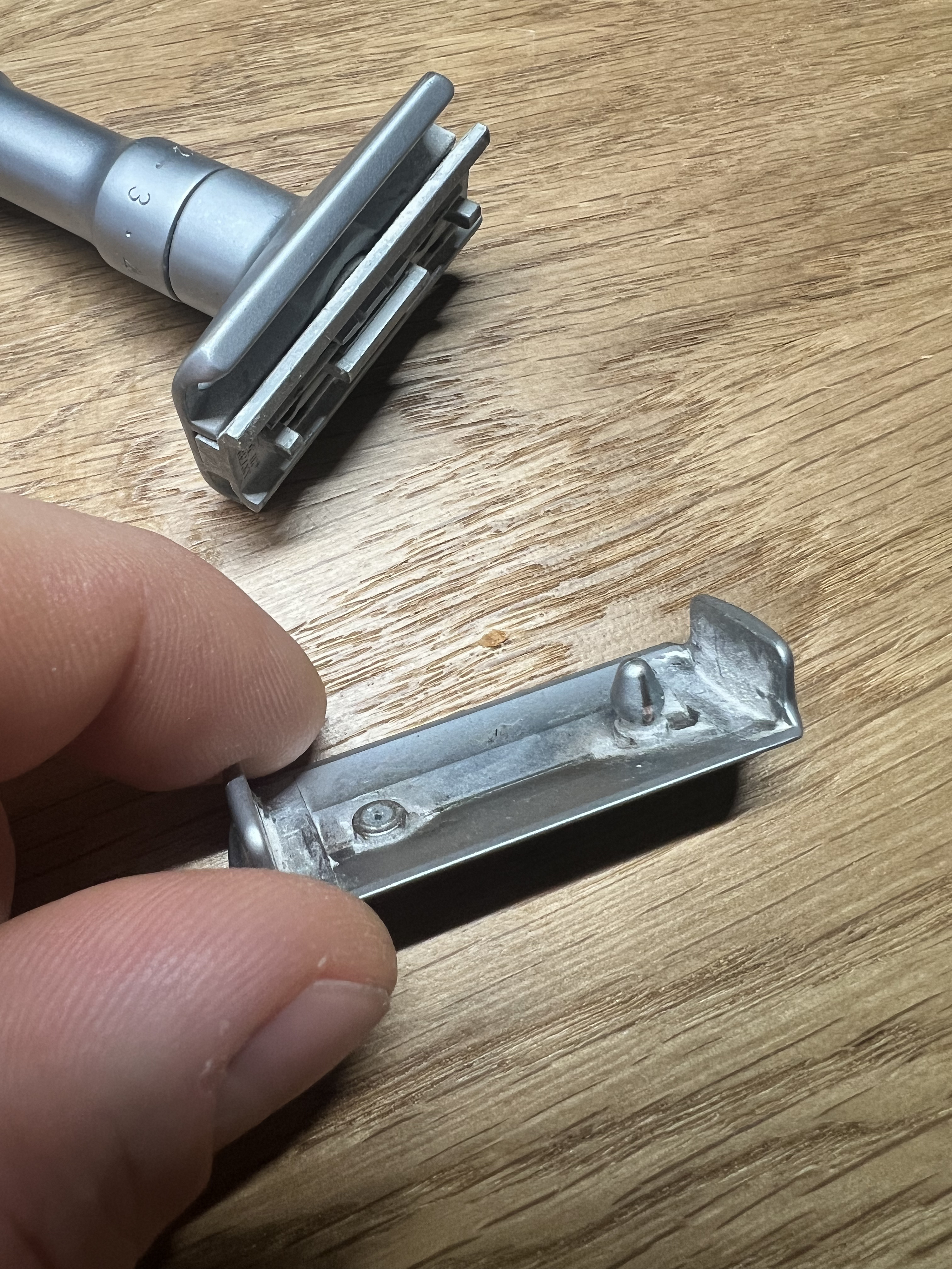 Замена лезвия в этом станке легче и безопаснее, нежели в винтовом: верхняя крышка головы отщелкивается небольшим усилием, а после смены лезвия защелкивается обратно.