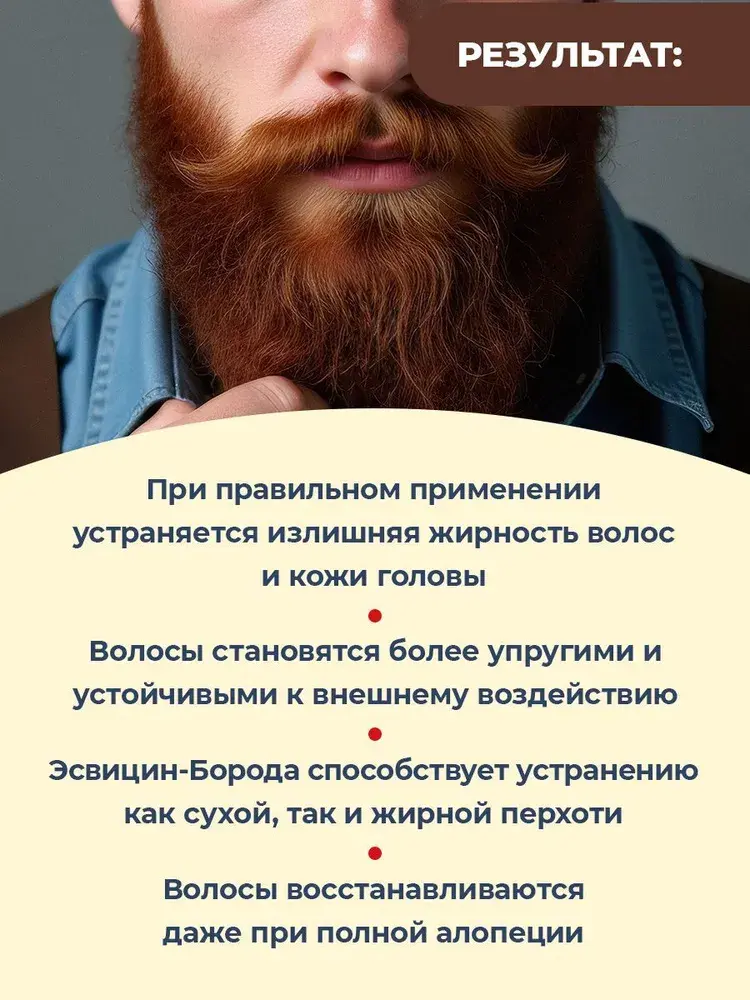 ПРЕИМУЩЕСТВА: Применение средства в зоне роста бороды способствует значительному повышению плотности и густоты волос за счет стимуляции их роста и предотвращения их преждевременного выпадения. Заметно улучшается и сама структура волос бороды и усов. Не содержит гормонов. Противопоказаний нет. Регулятор кислотности (Е507) делает возможным применения лосьон-тоника Эсвицин-Борода без перерыва неограниченный период времени, а также существенно повышает биодоступность микроэлементов раствора.