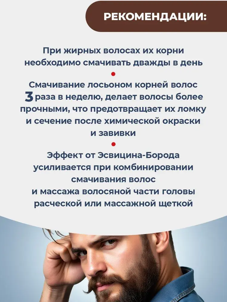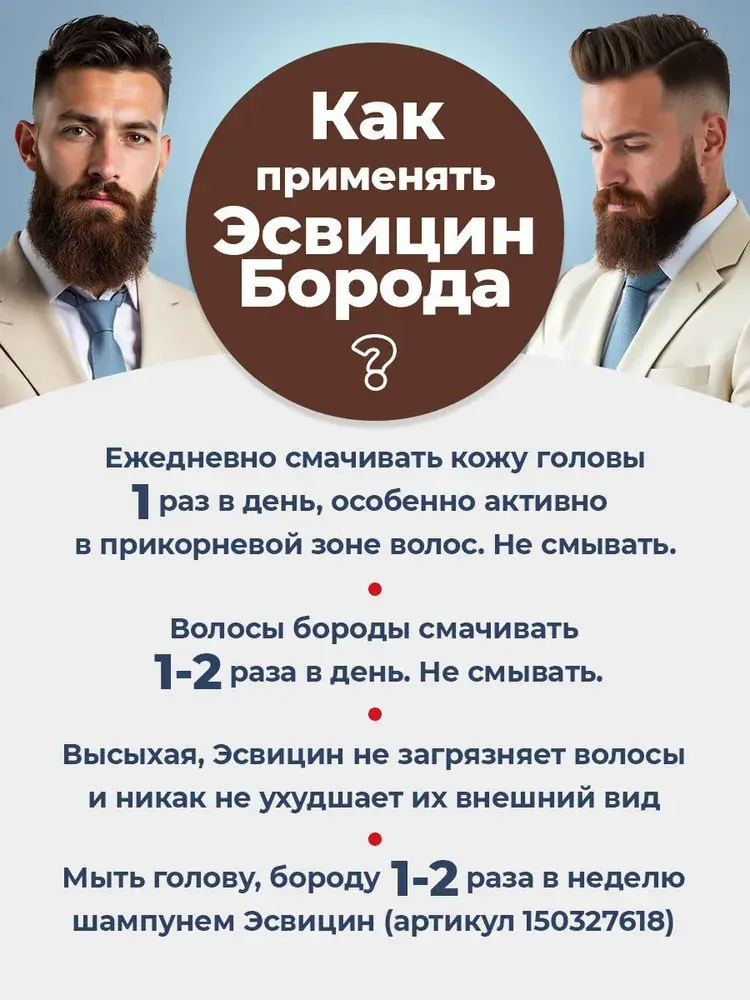 ПРИМЕНЕНИЕ ЭСВИЦИН-БОРОДА: ежедневно смачивать кожу головы, бороды один-два раза, не смывать. Мыть голову, бороду 1-2 раза в неделю шампунем Эсвицин. Для хорошего результата при функциональным расстройстве - 3-4 месяца; мужчинам с наследственным облысением – пожизненно; при полном облысении и алопеции 1-1,5 года до полного восстановления волос. К счастью, цена на лосьон-тоник Эсвицин-Борода позволяет рассматривать его как средство постоянного лечения выпадения волос, а также роста новых волос. При постковидном диффузном выпадении волос (COVID-19), в основе которого лежит капиллярный тромбоз, курс может быть меньше – от трех недель. При небольших, очаговых зонах выпадения используйте распылитель. (насадка-распылитель идет в комплекте). При нанесении средства на большую площадь – лучше наносить ладонью руки, распределяя раствор пальцами и слегка массируя. При этом, расход лосьона Эсвицин Борода будет выше, но и эффект от применения тоже значительно повысится. Часто трихологи в назначениях дополняют лечение такими средствами, как никотиновая кислота, мезороллер, миноксидил.