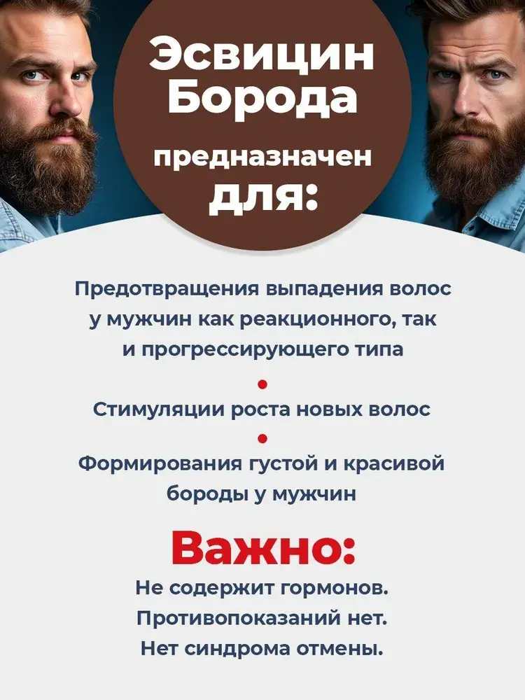 Новейшее мужское средство Эсвицин-Борода (с распылителем) предназначено для: предотвращения выпадения волос как реакционного, так и прогрессирующего типа; стимуляции роста новых волос, а также для формирования густой и красивой бороды и усов у мужчин.