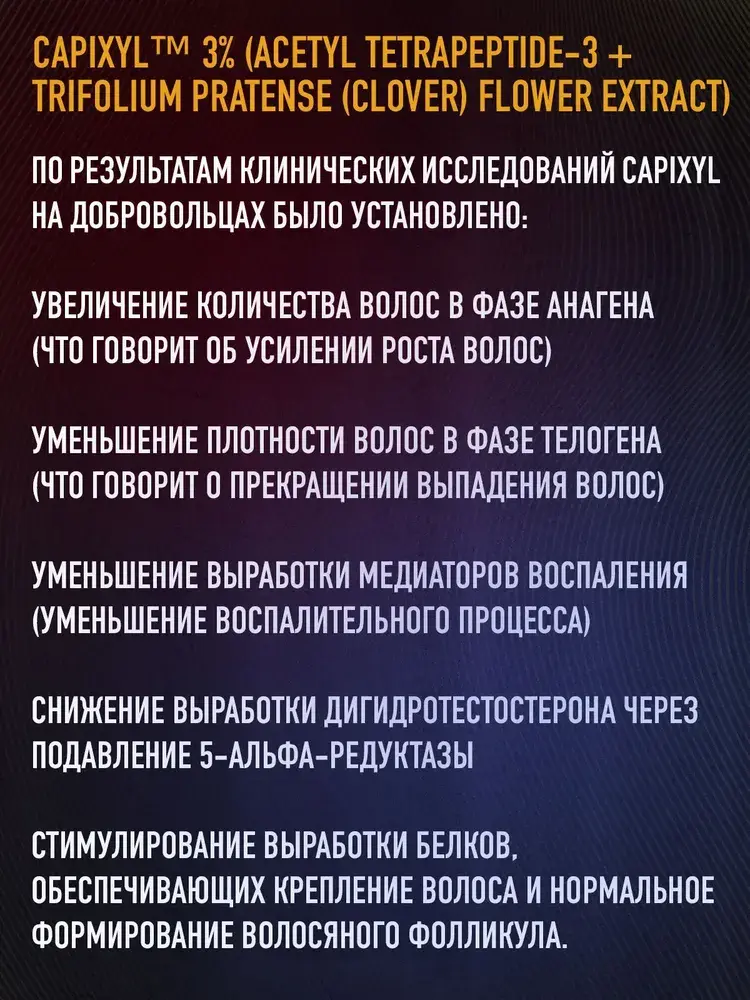 Capixyl 3% (Acetyl Tetrapeptide-3 + Trifolium Pratense (Clover) Flower Extract) - уникальная комбинация пептидного комплекса и биоханина А против выпадения волос.