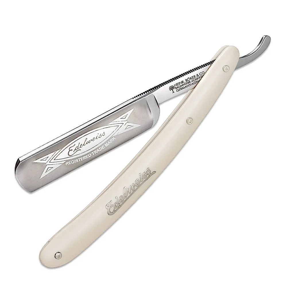 Edelweiss — элегантная опасная бритва от Boker. Выполнена на основе популярной исторической бритвы “Эдельвейс”. Бритва полностью изготовлена вручную с вниманием к деталям, она не только великолепно выглядит, но и демонстрирует легкое качественное бритье. Небольшая ширина лезвия в 15,8 мм делает бритву отлично подходящей для новичков, но при этом она также пользуется большой популярностью и у опытных пользователей. На обухе лезвия в области рукоятки нанесены противоскользящие зазубрины.