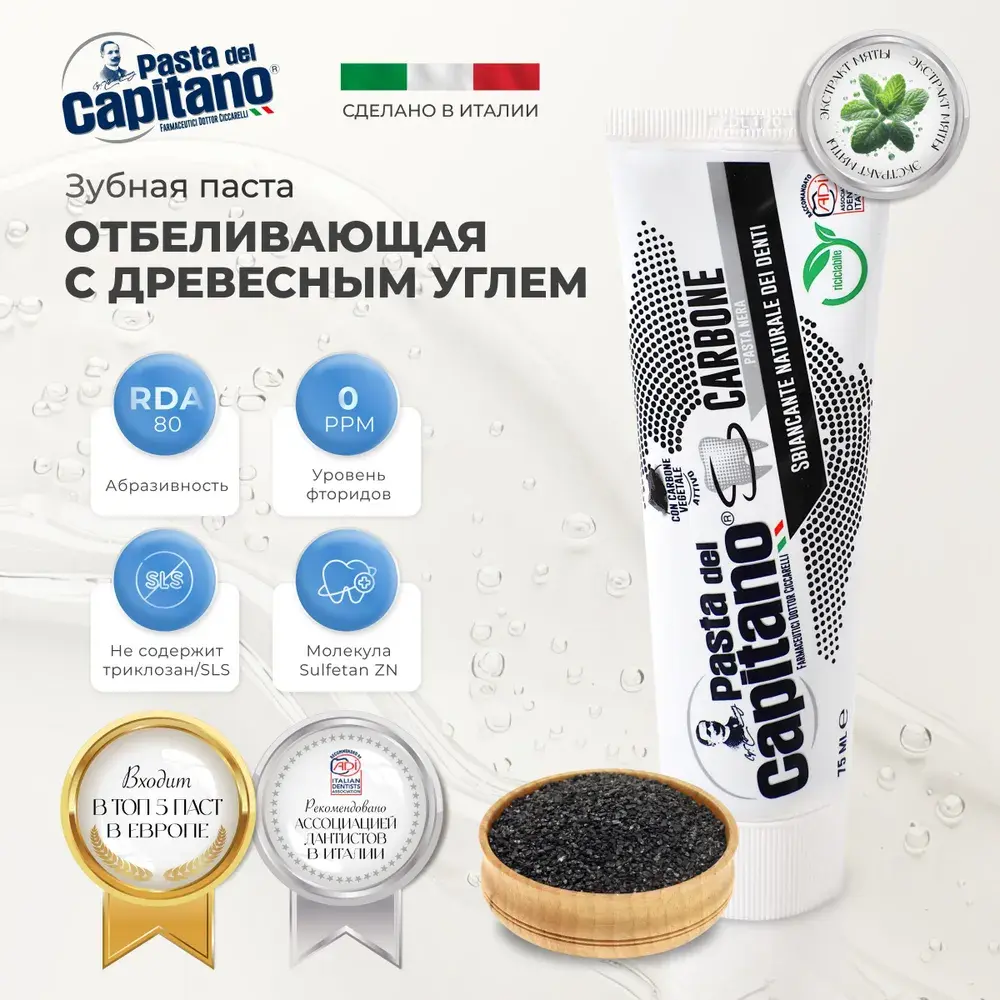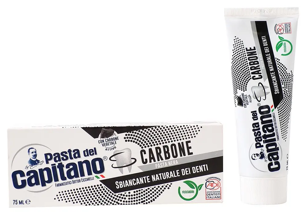 Pasta del capitano зубная паста отбеливающая с древесным углем - разработана для бережного очищения полости рта. Формула зубной пасты Pasta del Capitano с древесным углем в качестве активного компонента оказывает безопасное отбеливающее действие, предотвращает появление неприятного запаха (галитоза) и не наносит вреда эмали. Тестирование подтвердило постепенное возвращение зубам их природной белизны и эффективное воздействие угля на потемнения эмали от кофе, чая и табачного дыма.