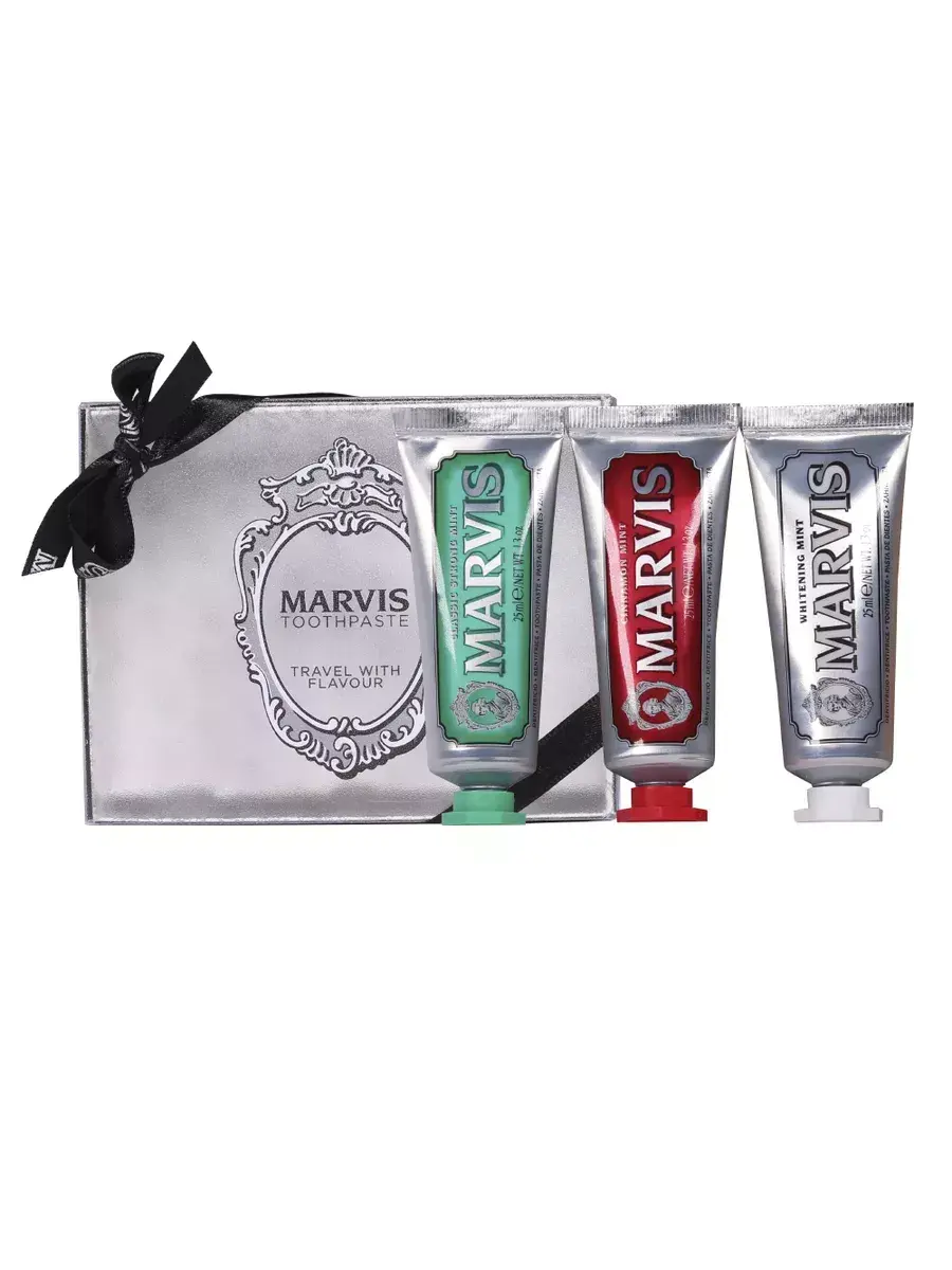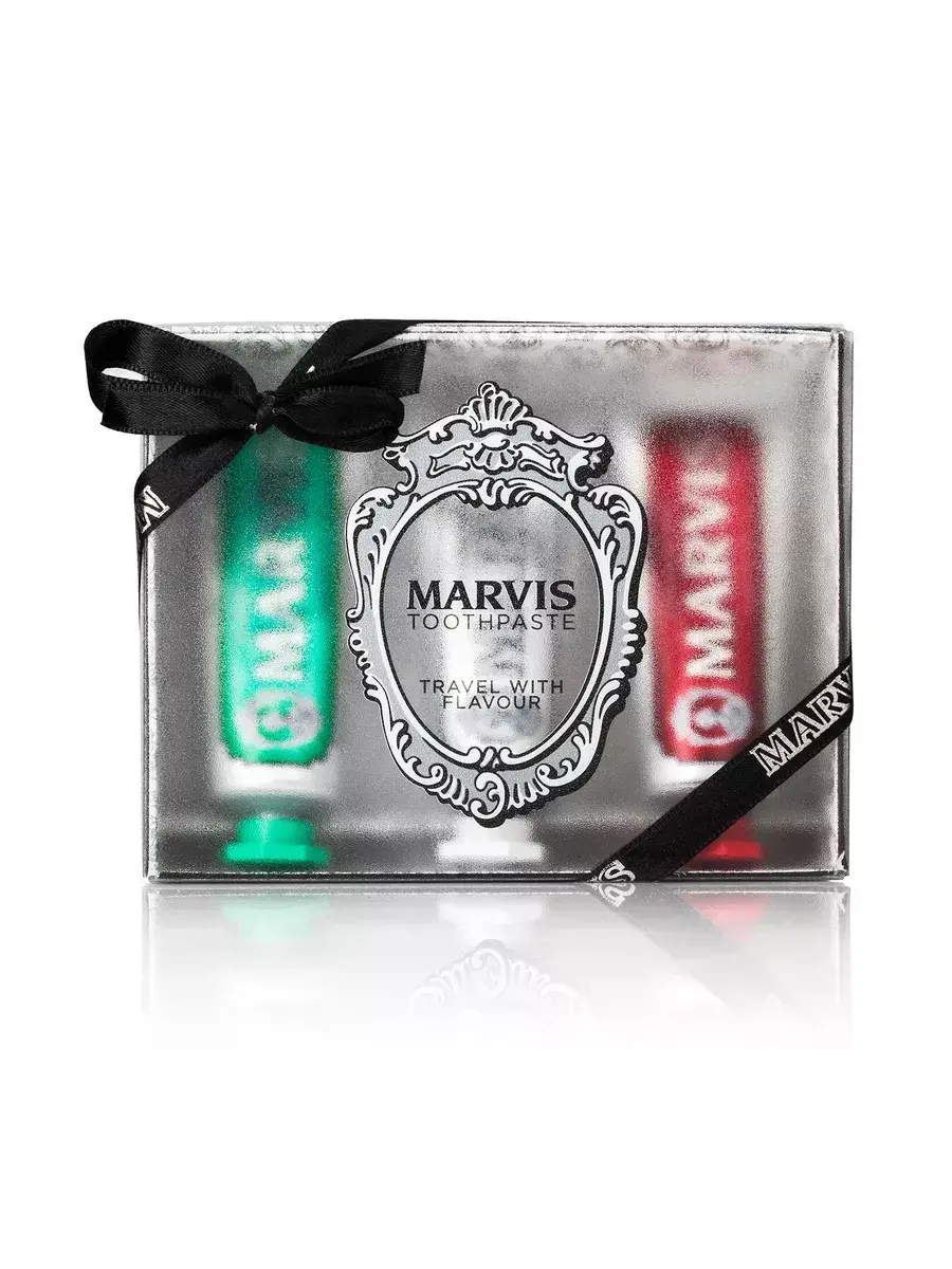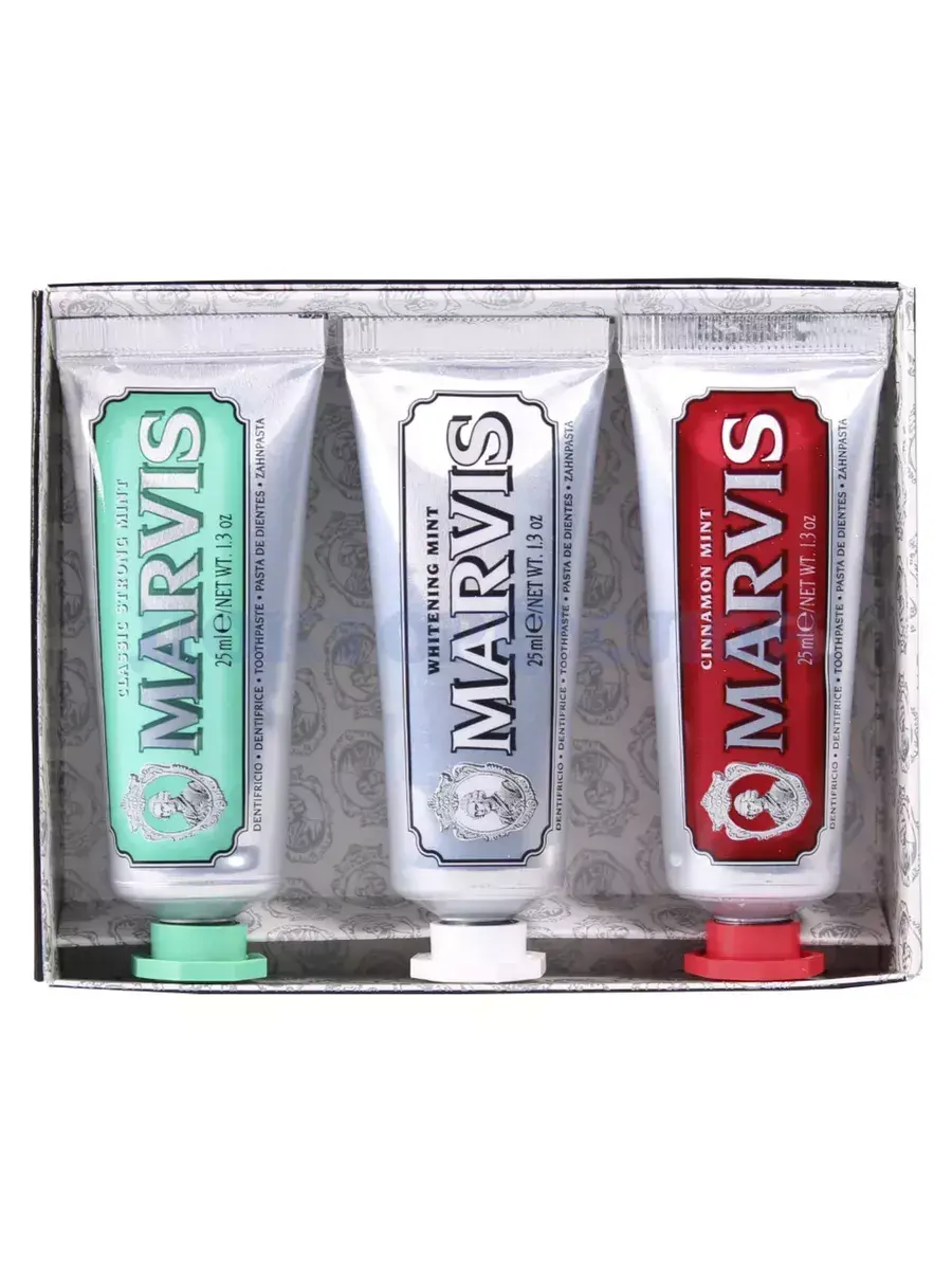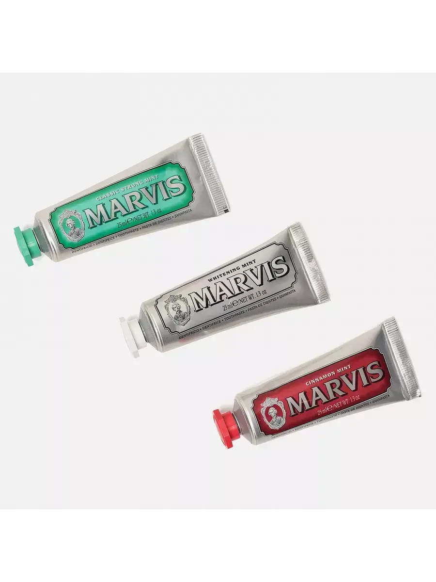 Набор включает в себя пасты MARVIS: Классическая Насыщенная Мята 25 мл, Мята и Корица 25 мл, Мята 25 мл