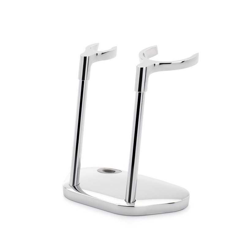 Традиционно подставка выполнена из латуни и покрыта хромом. Помазок на ней висит кистью вниз, станок – стоит, опираясь на пятку подставки. В основании держателя имеется углубление, которое поможет надежно зафиксировать рукоять бритвы.