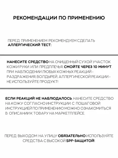При появлении раздражения немедленно вымойте лицо, прекратите использование и обратитесь к врачу. Не используйте сыворотку на шелушащейся, чувствительной или поврежденной коже. Во-первых, сделайте тест на переносимость. Не использовать одновременно с косметикой с пептидами, прямым витамином С, прямыми кислотами, ретиноидами, ЭУК и порошком ниацинамида.
